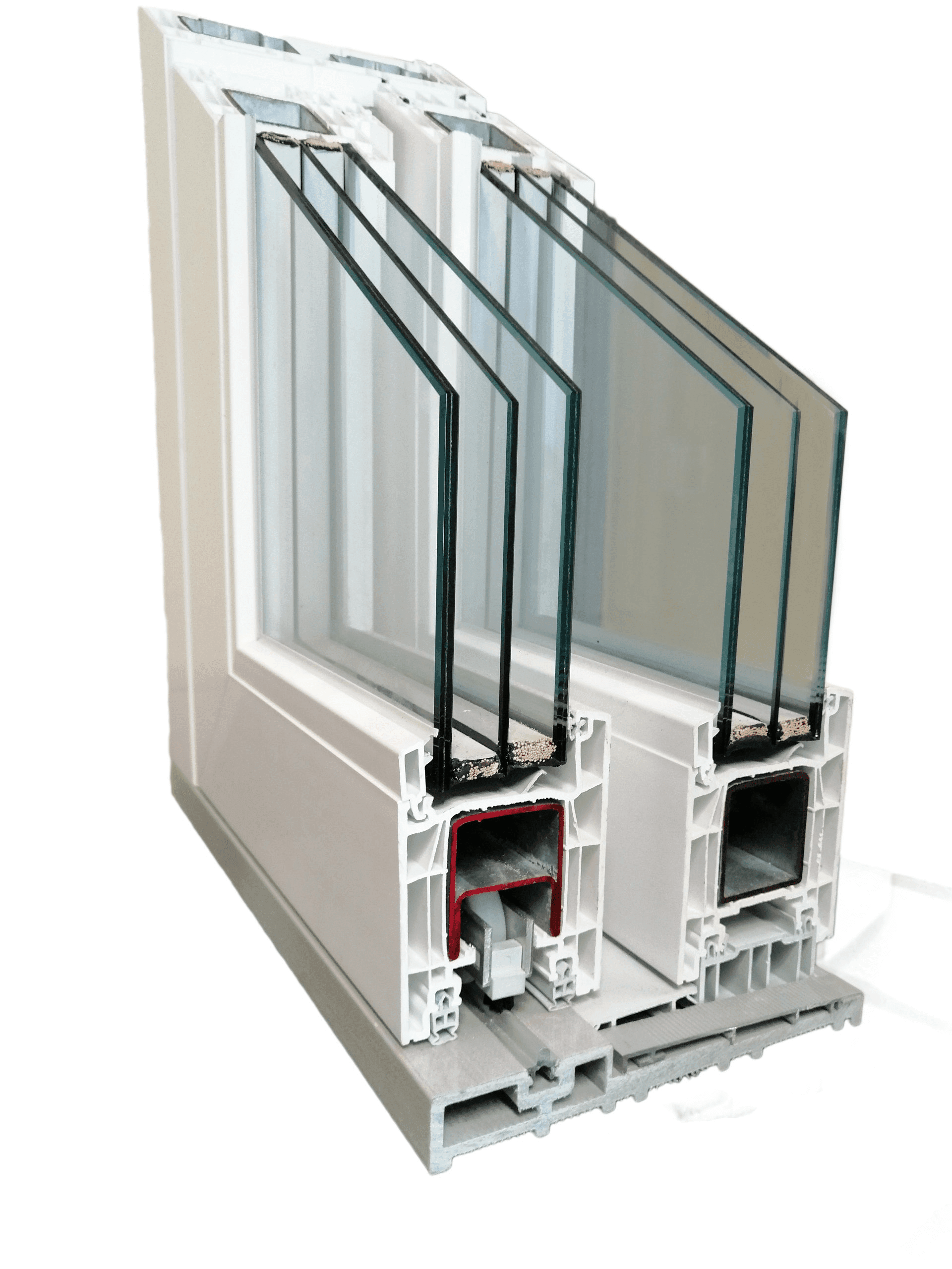 Il sistema prevede ante con profili a cinque camere di sezione 76 mm, dotate di guarnizioni di tenuta, ed all’interno dei quali vengono inseriti dei rinforzi in acciaio ed in alluminio per irrigidire la struttura. I fermavetri hanno una guarnizione coestrusa che aderisce al vetro e vengono fissati con sistema di incastro che ne permette lo smontaggio in caso di sostituzione del vetro.